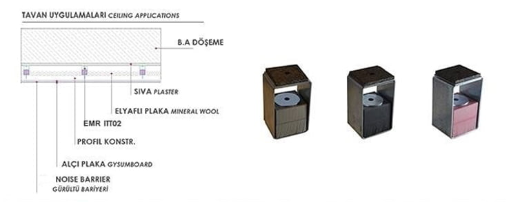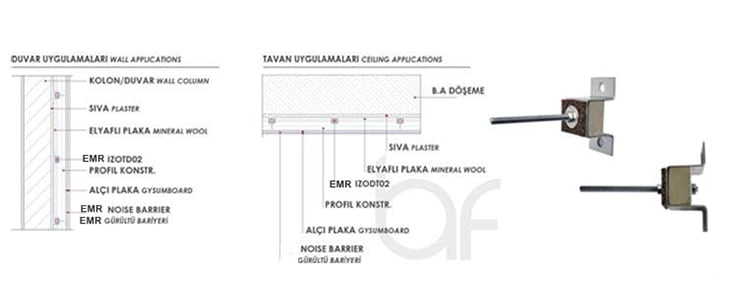 IZODT – 01 ürünleri, tüm yapı elemanları ile uyumlu, gürültü ve titreşim kontrolü sağlayan, özel elastomer izolatörlü duvar ve tavan taşıyıcı elemanlarıdır. İzolasyonlu tavan imalatı ve mekanik askı sistemlerinde, taşıyıcı konstrüksiyon ile döşeme arasında titreşim izolasyonu sağlar. Mekanik odalar, endüstri tesisleri, spor merkezleri, konferans, sinema, tiyatro salonları ile ofis ve konutlarda kullanılabilir. IZODT01 ürünleri, aksi gerektirmedikçe standart olarak 60 x 120cm akslarında bir adet olmak üzere kullanılır. Her yüzeyde kullanımı oldukça kolay ve ekonomiktir. Taşıyıcı konstrüksiyonları, uygulama yapılacak yüzeyden mesafe ayarı yaparak uygulanmasına olanak verdiği için, yüzeyde bulunan eğrilik ve gönyesizliklerin düzeltilmesine olanak verir.