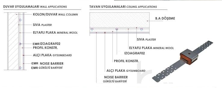 IZOAGRAF-01 ürünleri, özel üretim kauçuk izolatörlerden imal edilmiş, giydirme duvar imalatlarında, duvar taşıyıcı konstrüksiyonları ile diğer yapı elemanlarının doğrudan temasını engellemek için birbirinden ayıran titreşim sönümleyici malzemelerdir. IZOAGRAF-01 şaft duvarları, mekanik oda, konut – ofis gibi mahallerin ses yalıtımlı duvar imalatında kullanılabilir. IZOAGRAF-01 ürünleri, standart olarak 60 x 120 cm akslarında bir adet olmak üzere kullanılır. Her yüzeyde kullanımı oldukça kolay ve ekonomiktir. Galvaniz ve kutu profil konstrüksiyonlarının, brüt beton, gaz beton ve tuğla duvarlara doğrudan tema sını engellemek için kullanılabilir.
